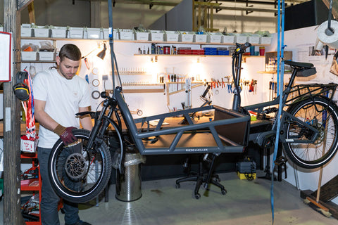 Notre objectif est que vous puissiez rouler à vélo en toute sécurité, de manière fiable et avec joie toute l'année. Pour y parvenir, nous avons spécialisé notre atelier dans les vélos cargo Riese & Müller. Nous avons en stock de nombreuses pièces de rechange et d'usure pour votre vélo et pouvons généralement vous aider dans les 24 heures. Les rendez-vous peuvent être pris facilement en ligne. Les inspections, réparations ou autres services tels que l'entretien ou la mise à niveau des fourches à suspension sont possibles sans aucun problème. Afin de ne pas restreindre votre mobilité quotidienne, nous mettons volontiers à votre disposition des vélos de remplacement. En bref, nous pensons savoir à quel point votre vélo est important pour vous et votre famille.